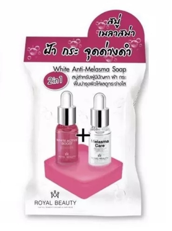 รอยัลบิวตี้ สบู่ลดฝ้า กระ Royal Beauty White Anti-Melasms Soap ช่วยชำระล้างสิ่งสกปรกอย่างอ่อนโยน ด้วยสารทำความสะอาดจากผลไม้ เหมาะสำหรับผิวที่มีปัญหาฝ้า กระ และจุดด่างดำ พร้อมสารสกัดจาก Passion Fruit, Kakadu Plum ที่มีปริมานวิตามินซีมากกว่าส้มถึง 100 เท่า และอุดมไปด้วยสาร Anti-Oxidant และเพิ่มคุณค่าการบำรุงด้วย Whitening Complex, Multi-Vitamin ที่มอบความชุ่มชื้นสู่ผิว เผยผิวสวย แลดูกระจ่างใส เรียบเนียน อย่างเป็นธรรมชาติ