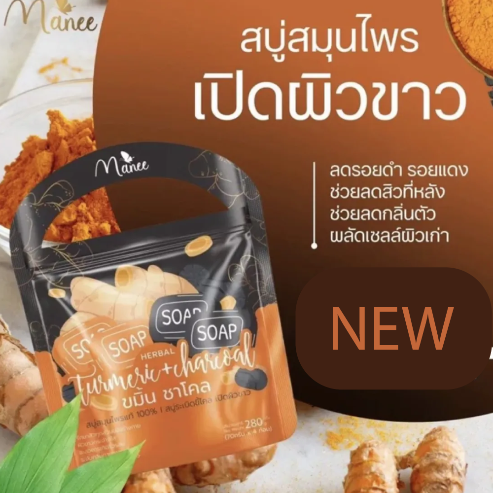 Manee สบู่มณี สบู่สมุนไพร ขมิ้น+ชาโคล (1 ถุง บรรจุ 3 ก้อน)