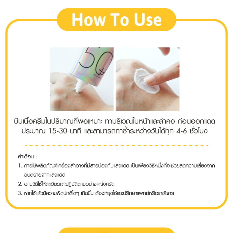 บีบและทาครีมกันแดดในปริมาณที่เหมาะสมให้ทั่วใบหน้าและลำคอ 15-30 นาทีก่อนออกไปข้างนอก