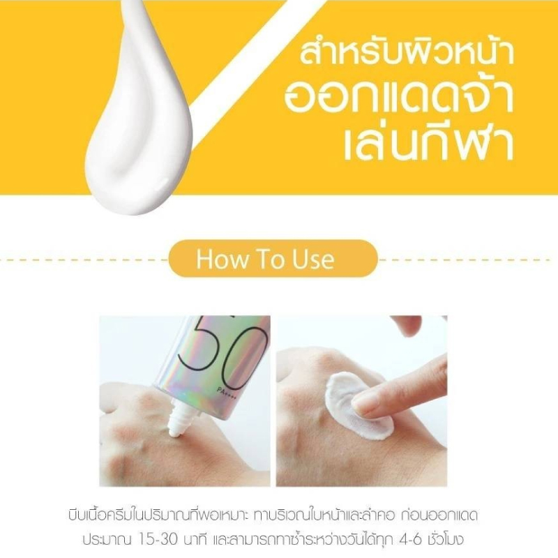 วิธีใช้ : บีบเนื้อผลิตภัณฑ์ในปริมาณที่พอเหมาะ ทาบริเวณใบหน้าและลำคอก่อนออกแดดประมาณ